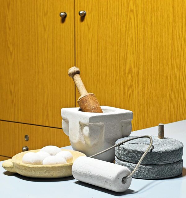 Miniature Sculptures: Stone mortar, millstone, rolling machine and plate