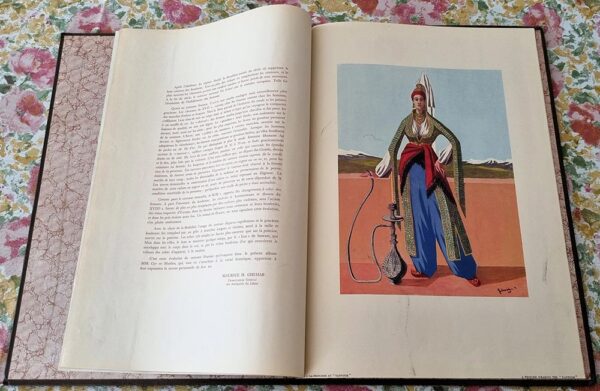 Colored old art print reproductions of traditional Lebanese folklore and Lebanon costumes countrysides.
