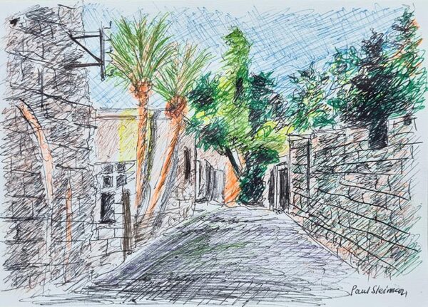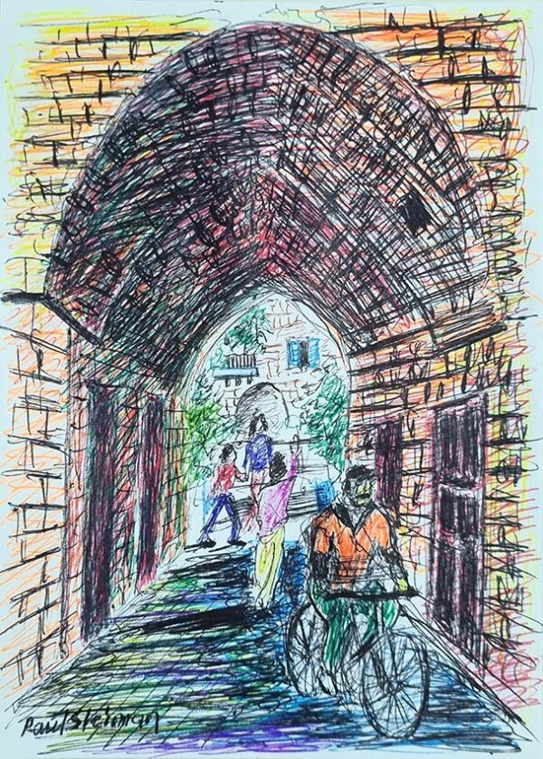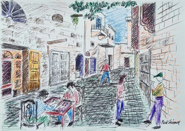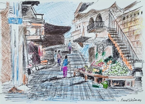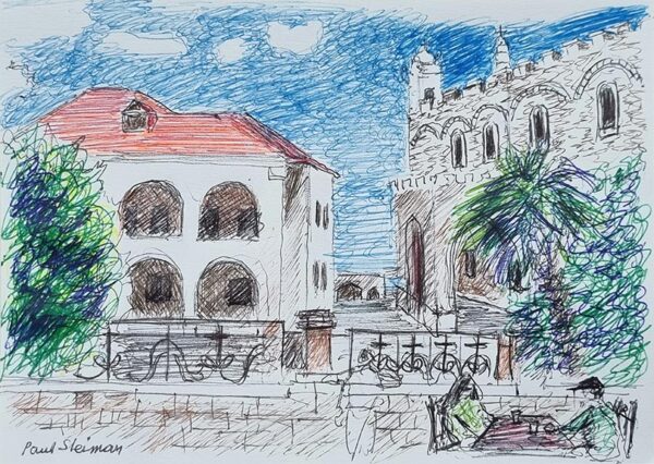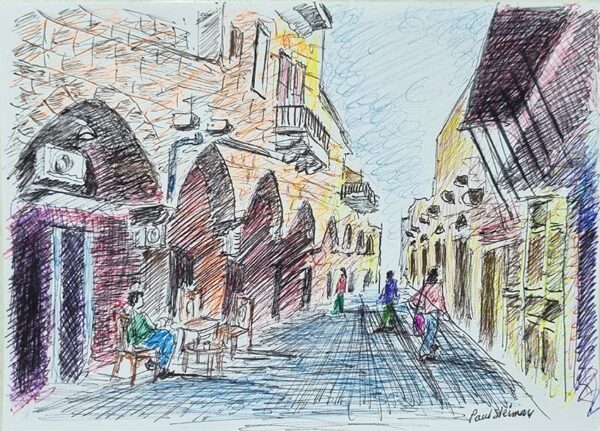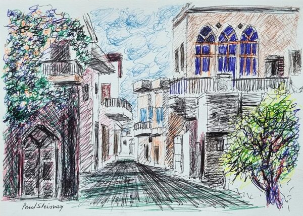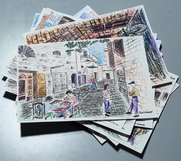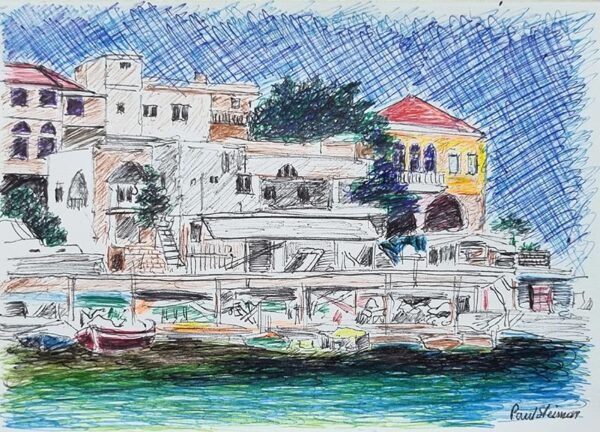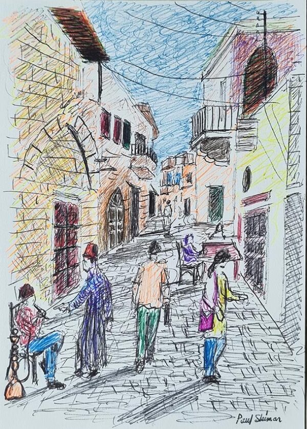 Original art drawings on watercolor papers signed by the Lebanese artist painter Paul Sleiman. Artworks – Day of hiking in the beautiful old city of Batroun.