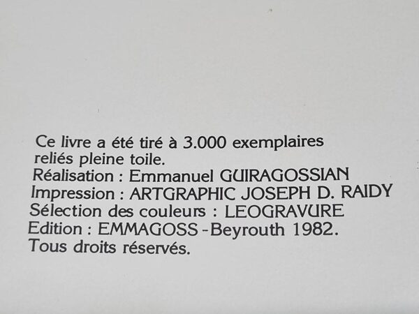 Ce livre a été tiré à 3000 exemplaires reliés pleine toile. Réalisation: Emmanuel Guiragossian – Impression: ArtGraphic Joseph D. Raidy – 1982