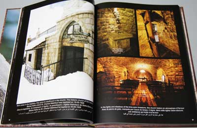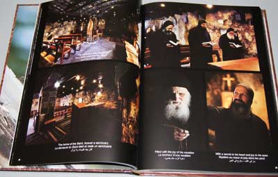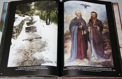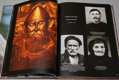 Book size: 33 x 24 x 2 cms – Hardcover (with gauffrage) – 202 pages and a poster inside showing a sculpture of Saint Charbel in gauffrage by Michel Sakr (Bas relief sur cuivre) – 1.6 kg.