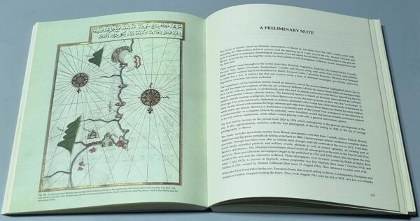 This volume also has a historical section, consisting of eleven chapters that describe many major political and social events such as sectarian conflicts, changes in political thought, bombardments of the city, famine, Turkish oppression as well as economic developments, influx of pilgrims, social life, etc. and a detailed topographical description of the harbour and its enlargement, the old city, its walls, newly built districts outside the city walls, khans, hotels, restaurants, coffee shops, public baths, urban developments, a new water supply system, the railway line to Damascus, burgeoning educational institutions, the looting of antiquities, the quarantine system and many other aspects.
