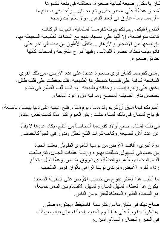 With so many other little villages on earth, naive and old-fashioned like their landscapes, Kfar Sama kept a child’s heart which beat at the rhythm of its faith, of its tenderness, and of nature; a heart which had the patience of winters that hold seeds…