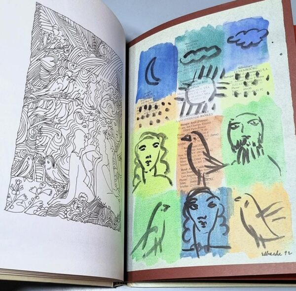 As it was, together we conceived and gave life to this work, scrupulously respecting the delicacy of Amin’s original aquarelles and all the eloquence of their depth and breadth. Somewhere along the way we added a group of pen and ink drawings which not only create yet another dimension but provide a splendid counterpoint for his “illuminations”, highlighting the place they hold in his art.