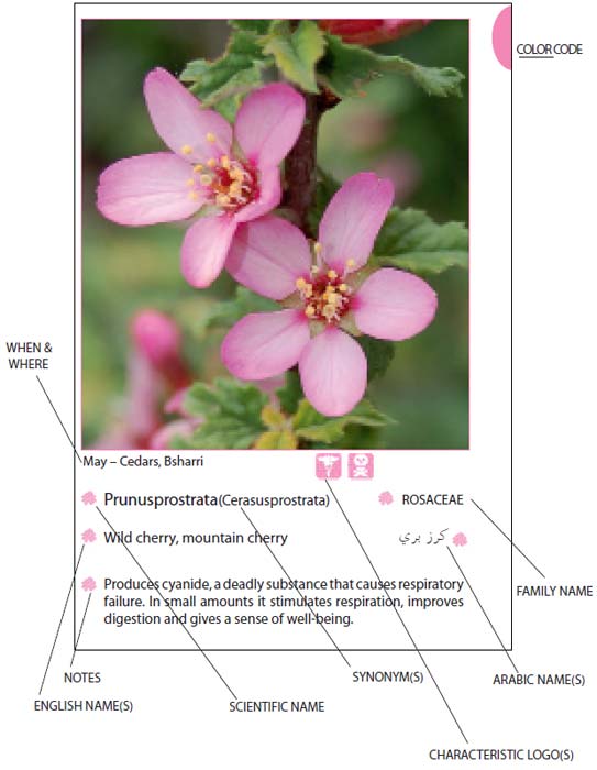 This color-coded guide is designed to be a field companion in nature. Within its compact size, one can find a wealth of information about flowers that are clearly photographed. Information about significant flower characteristics like toxic, edible, endemic, Lebanese, endangered, aromatic, and medicinal properties are illustrated by symbols. English, Arabic, and scientific names are indicated, in addition to the time and location of flower capture. Some info is also included in text format. The guide is rich in indexes, making it easy to get to any plant by any given property.