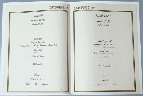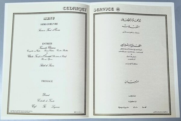LebanonPostcard presents a unique old collection of beautiful folders which were presented during your flight with MEA – Middle East Airlines. Each document presents a lovely painting on one side (Aquarelle / Watercolor by Dagmar Hodgkinson) and inside the folder, you can find the Menu of the Lebanese Cuisine presented to passengers.