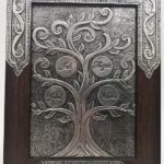 The size of the artwork is 37×27 cm using wood and pewter. The inscription is done with white metal.