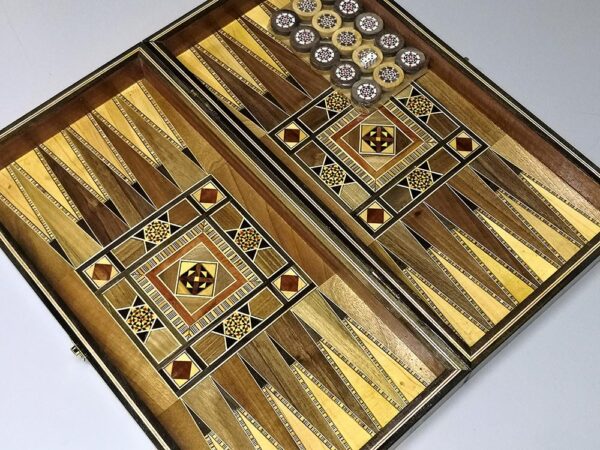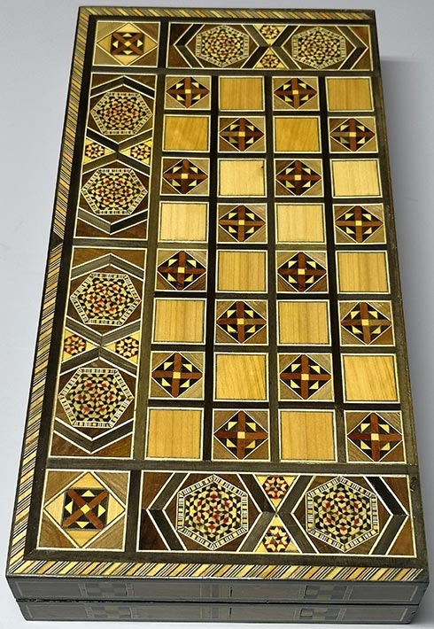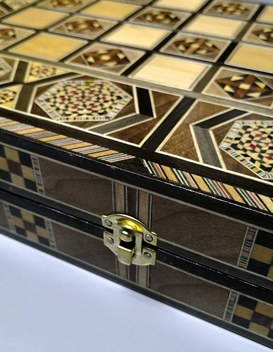 LebanonPostcard presents a large hand-made mosaic wooden backgammon game. The Backgammon board (with dice and set of counters) is made of real mosaic. Dimensions: 49.5 x 50 x 8 cm.