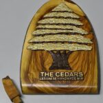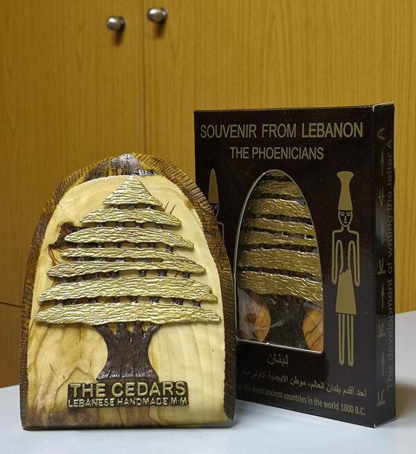 Choose gold, green cedar or Phoenician alphabet metal stand for your desk and table… a reproduction of the Phoenician era, 15×11 cm – The cedars are sculpted and added on a slice olive wood log. The stands come with a beautiful box.
