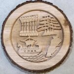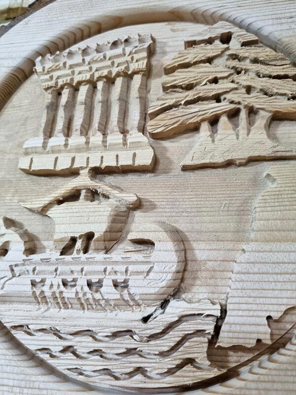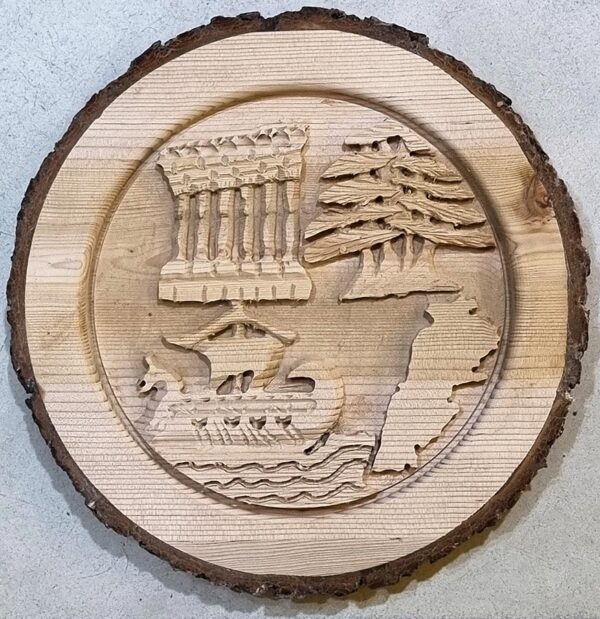 The sculpted artworks are presented on half-logs of real cedar wood with Lebanese emblems: Baalbek, the cedar tree, the Phoenician boat, and the map of Lebanon. The size of half-logs is about 26x26x2 cm for the first model and 31x31x2 cm for the second model.
