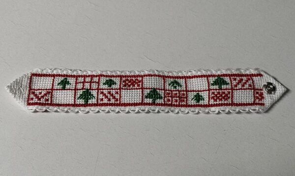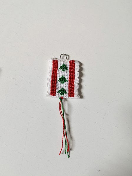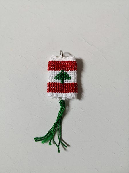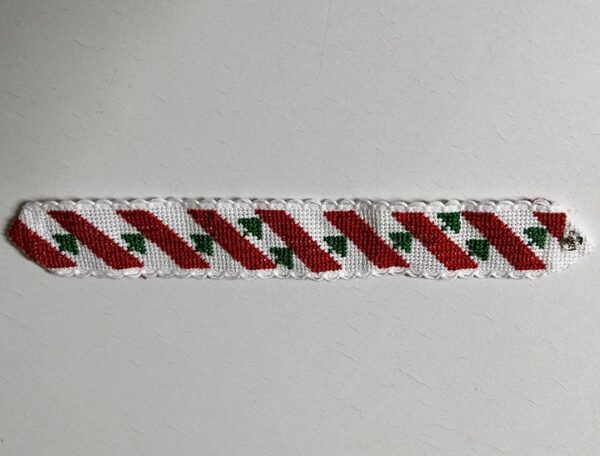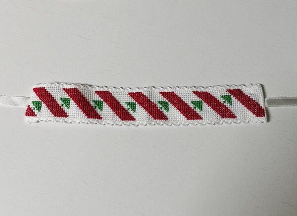 Bands and pendants in Cross Stitch (Embroidery), patterned with the colors of the Lebanese flag and the cedar of Lebanon.