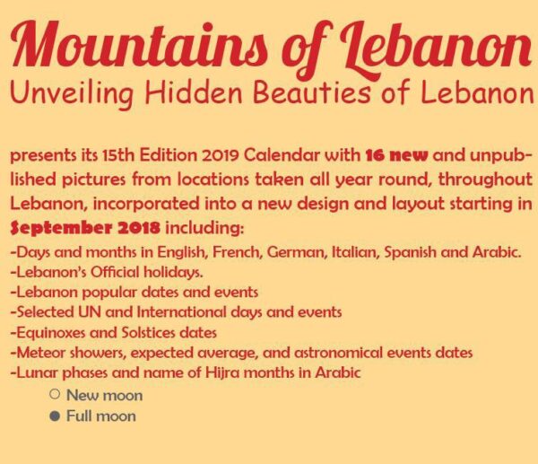 Mountains of Lebanon Calendar 2019 – Unveiling Hidden Beauties of Lebanon. 16 months calendar starting September 2018. Size: Folded size 34×24 cm, Open size 34×48 cm.