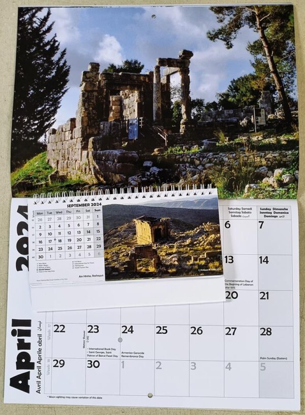 Mountains of Lebanon, Temples of Lebanon, Deskpaper calendar 2024, 22×10 cm – Unveiling Hidden Beauties of Lebanon – New moon / Full moon and double 24 images recto/verso.