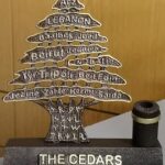 Wooden cedar metal stand – Cedar of Lebanon with names of Lebanese cities and Phoenician first Alphabet.