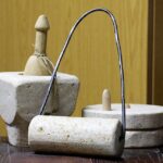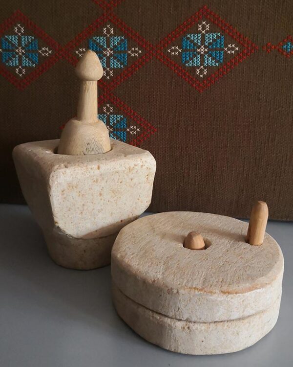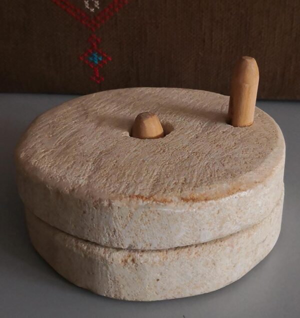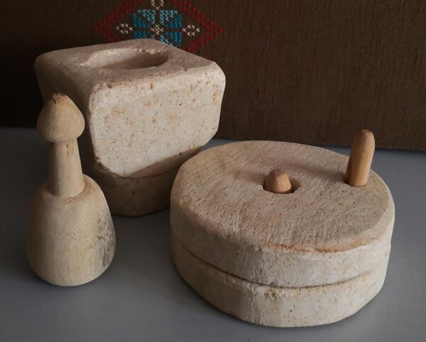 Each crafted sculpture is made with care: The Mortar is 20 x 12 x 12 cm and is 3 kgs – The Millstone is 15 x 15 x 7 cm and is 2.6 kgs – The old rolling machine is about 14 x 26.5 cm and is 1.4 kgs.