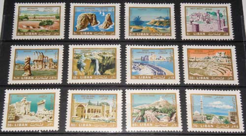 – Twelve stamps. Places of Lebanon and Cities: Beyrouth l’hippodrome, grotte aux pigeons, Tabarja, Beit-Mery, Anjar, Djezzine la cascade, Saida chateau de la mer, Byblos l’amphitheatre, Baalbeck, Beit ed dine le palais, Nahr el Kalb, Tripoli,